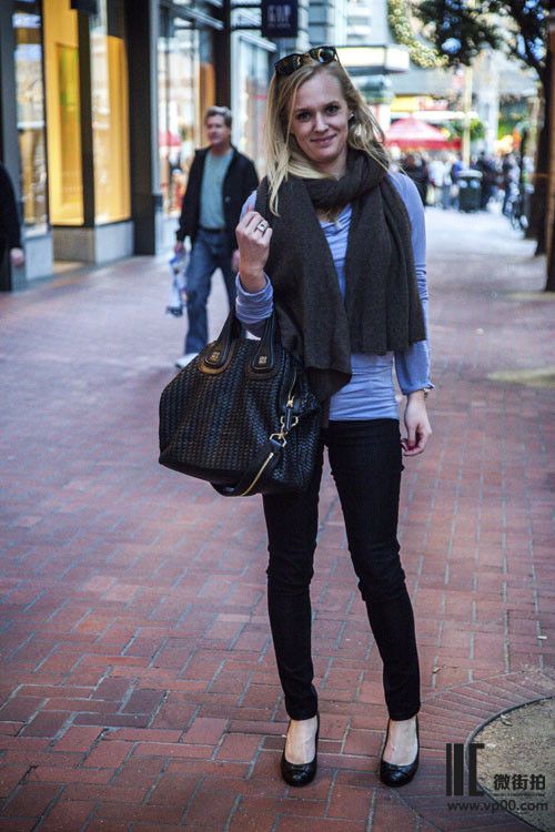 蓝色上衣和黑色小脚裤的搭配看似随意,但却更能穿出新意,而颈间的厚围巾也为其增添了一丝暖意。
